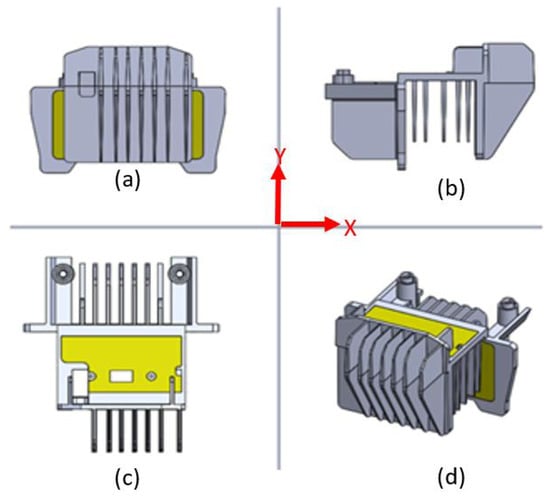 Figure 7 depicts the prototype of the composite radiator for headlights, which consists of aluminum alloy and thermoplastic polymer parts. Figure 7a–c present the top, side, and front views, respectively.