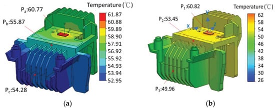 Figure 6 shows three temperature points: namely P1, representing the pad temperature of the LED module; P2, representing the temperature of the mostly aluminum alloy body; and P3, representing the temperature on the composite radiator surface. P1, P2, and P3 were 60.82 °C, 53.45 °C, and 49.96 °C, respectively. Figure 6a,b present the simulation results of the pure aluminum alloy and the composite radiator for headlights, respectively.