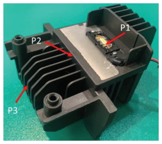 Figure 8 reveals the temperature measurement points on the pad of the LED module (P1) of the prototype, the temperature measurement points of the mostly aluminum alloy body (P2), and the temperature measurement points on the composite radiator surface (P3). We use the TECPEL DTM-317 (TECPEL Co., Ltd. Factory, New Taipei City, Taiwan) to measure the temperature as a thermocouple. At an ambient temperature of 26 °C, the P1 temperature was 60.8 °C.
