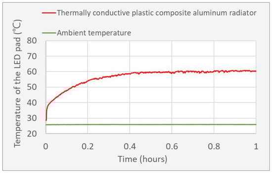 Table 2 summarizes the simulation results at the ambient temperature (Ta) of 26 °C; specifically, it shows the pad temperature of the LED module (P1), the temperature of the mostly aluminum alloy body (P2), and the temperature on the composite radiator surface (P3). For the aforementioned temperature values, the temperature of the composite heat sink in the LED pad was similar to that of the pure aluminum alloy heat sink.