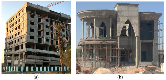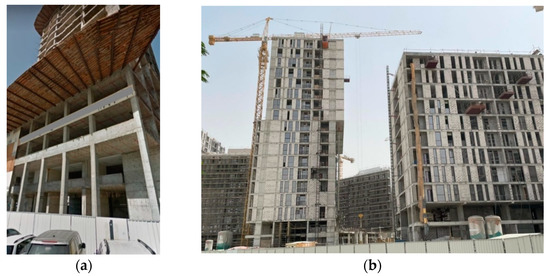(a) High-rise buildings under construction in Sharjah [own materials]. (b) High-rise buildings under construction in Sharjah [own materials].