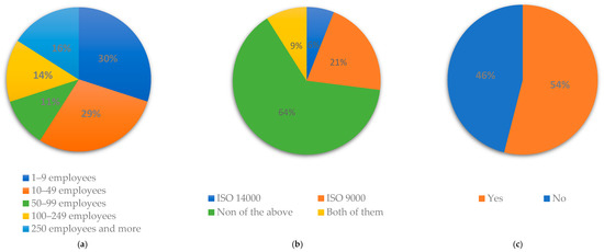The structure of the surveyed population: (a) the number of employees; (b) held ISO certificates; (c) the internal regulations related to waste reduction.