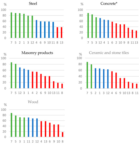 Based on the respondents’ answers to the survey questions, five subsets of data were created. Each of them included data concerning 13 waste reduction methods that are used in relation to a specific building product, namely, steel, concrete, masonry products, finishing products, and wood (Figure 4).
