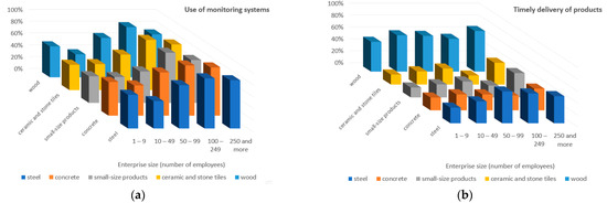 Figure 6a shows a graph illustrating the frequency of applying the “Use of monitoring systems” method in companies of various sizes. The height of the bars for all groups of products indicates increasing trend of used methods along with the size of companies. In turn, Figure 6b shows a diagram illustrating the frequency of using the “Timely delivery” method in companies of various sizes. In this case, the height of the bars does not show an unequivocal growing trend of used methods along with the size of companies. However, a much higher frequency of using this method can be noticed in companies of all sizes for wood products when compared to other product groups.