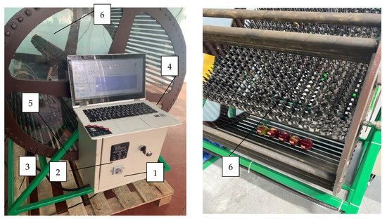 General view of the laboratory installation to assess the force impact of the prototype device for assessing the suitability of varieties and hybrids for mechanized harvesting: 1—ground support; 2—control cabinet; 3—drum; 4—personal computer; 5—data logger; 6—finger-type slide.