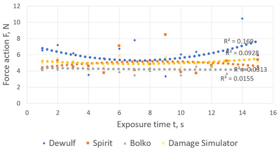 The time interval of 8.5 to 9.5 s accounts for the highest force action (of up to 22 N) on the potato tuber (Figure 6), here the mean square deviation and the variation coefficient are σ = 5.7 and ν = 24.8%, respectively.