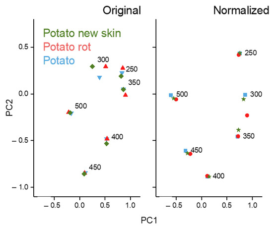 PCA application to the potato tubers results in visible differences only at 300 nm excitation (Figure 8). The normalization procedure increases the variance described by the first two components, PC1 and PC2, from 51.4% to 63.0%. However, this result does not coincide with the correlation analysis, where data normalization increased the correlation coefficients between the reference potato tubers and the mechanically damaged ones.