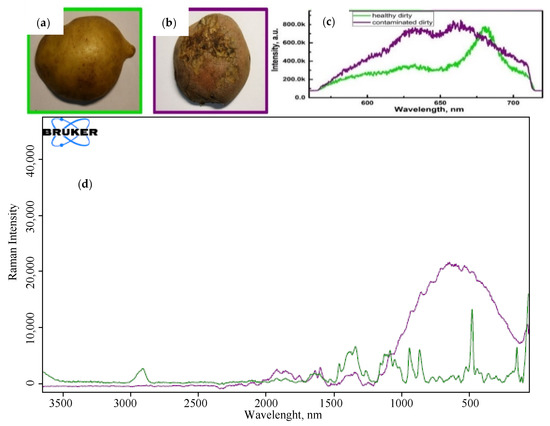 Example of sampling points of the marketable (a) and sorted-out (b) potato tubers. Normalized (averaging five spectra) fluorescence and RAMAN (d) spectra of the marketable and sorted-out potato tubers of the Kumach, Udacha, and Zhukovsky varieties, respectively (c).