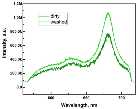 The potato tubers were then thoroughly washed of dust and soil residues without damaging the skin. The fluorescence spectra of the washed and dirty potato tubers were compared to assess the contribution of dust and soil to the overall spectrum (Figure 9).