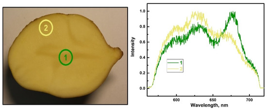 The fluorescence spectra of the central part and the main volume are different for this sample. Similarly, the fluorescence spectra of the central part and the main volume of the sorted-out potato tuber of the Zhukovsky variety were examined (Figure 11).
