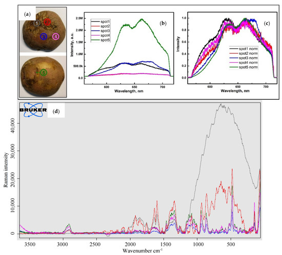 Example of sampling points of the marketable (a) (left and above fluorescence spectra (image above-b,c) and RAMAN spectra (image below-d) of the different damaged parts (1-2—highly damaged, 3-4—thicker and thinner parts of the skin correspondently, 5—eyehole) of the potato tuber of the Zhukovsky variety.