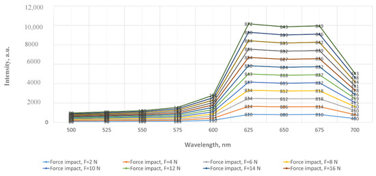 The maximum interval of the difference in fluorescence spectra intensity is observed in the wavelength ranges between 625 and 700 nm, with a clear conditional separation of the force impact from 2 to 24 N. Thus, it is necessary to notice that only the potato tubers at the maximum force impact up to 12 N are suitable for stable storage after harvesting and postharvest handling. A further increase in mechanical effect in the studied range excludes any possibility of storing such potato tubers as the damaged tubers provoke the growth of various pathogens, including their spread on marketable ones. The maximum value of 872 units of fluorescence spectrum intensity in the wavelength range of 625–700 nm was observed under the force impact of 24 N, followed by a reduction in spectrum intensity in the average value of 2.5% for each interval of the lesion range within the whole wavelength spectrum, with the minimum value of spectrum intensity of 800 units, corresponding to the wavelength of 700 nm and the force impact of 2 N.
