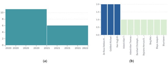 An example of the application of the search methodology presented above can be seen in Figure 2 for the Lens platform. Initially, we obtained 161 patents that fulfilled the respective filters: of which 84 appear as patent applications, and the remaining 77 are published patents. Moreover, out of the 161 patents, 120 complied with the requirement of filter 8. After applying filters 5 and 7, we obtained a number of 74 patents. Further, using filters 6 and 12, we get 74 patents. The numerical distribution of these patents by year of publication and by inventors can be seen in Figure 2.