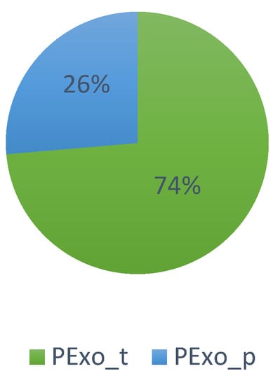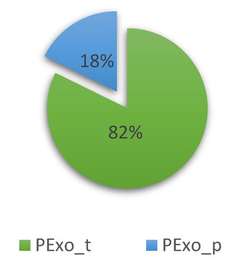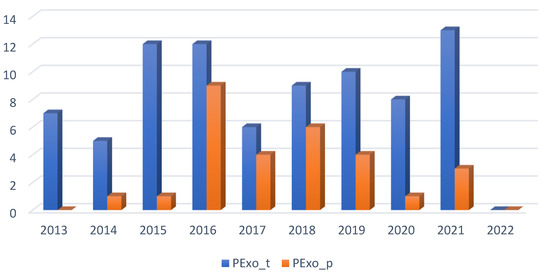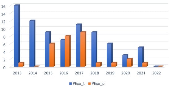 Figure 11 shows the following: a fluctuation in the number of patents published on PExoRP, in the sense that their number increased significantly in 2016, decreased in 2017, increased in 2018, and then fell and increased again in 2021. As for the number of patents published on PExoRNP, it seems to keep the same trend of increase and decrease every 2 years (+/− 1) until 2018, and then there will be a more considerable difference in the period 2019–2020 (+3), and 2021–2022 (−2). Patents published on PExoPR gain interest only in 2019 and then decrease. There is also an interest in PEoxS since 2015, continuing with growth peaks in 2019 and 2021. Overall, we can say that patents published on PEoxRP predominate throughout the period compared to other types.