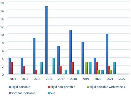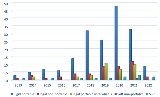 Distribution of patents by year of publication, the type of structure, and portable mode.