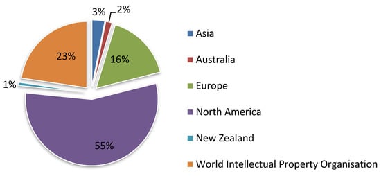 As we did in the previous case, we analyzed the number of applications and the number of patent publications on this platform. The distribution by region according to the year of application of the patent after the use of the filters 5 and 7 can be seen in Figure 6. The highest percentage of patent applications is registered in South America.
