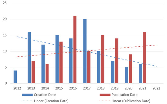 As can be seen from Table 6, the period in which we find information is longer. It includes requests since the early 2000s. As in the case of the analysis in the previous subsection, due to the minimal number of applications/publications, we can conclude that the valuable research period can be considered as starting with the year 2012. Hence, in this case, the data distribution confirms that the period in which we did the analysis is correct and fair.
