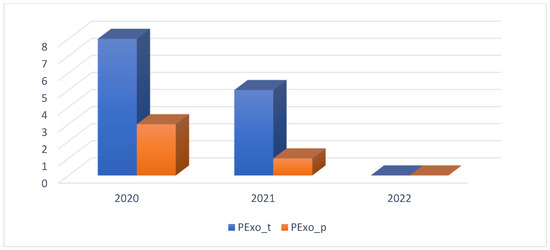 In Figure 13, you can see the numerical distribution of patent types based on the year of publication. For example, according to Figure 13, there is a decrease in published patents. Their distribution by structure and applicability is as follows: in 2020, eight PExoRP, two PExoRP and one PExoS; in 2021, five PExoRP and one PExoRP, and in 2022 it is completely absent.