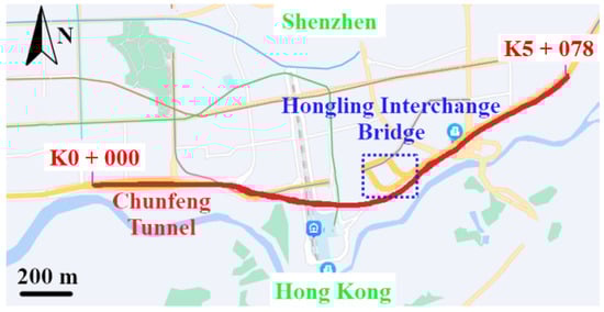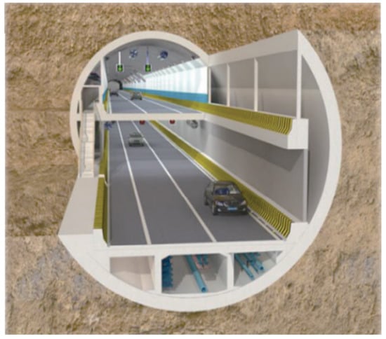 The Chunfeng tunnel project is a significant transportation project of Shenzhen’s Eastward Strategy. It is designed according to the technical standards of an urban expressway [16], with a total length of about 5.1 km. The plan of the line is shown in Figure 1. The total length of the underground road (tunnel) is about 4.3 km, and the length of the shield section is 3.58 km. The tunnel adopts a double-layer structure of a single tunnel, and the upper and lower layers can accommodate two-way traffic (see Figure 2). A super large-diameter slurry balance shield with a diameter of 15.8 m was used for tunnelling in the shield section. In April 2019, as China’s largest slurry shield tunnel, it was also the first motor vehicle tunnel constructed by shield technology and the first single tunnel double-layer motor vehicle tunnel in Shenzhen. The shield machine of the Chunfeng tunnel started smoothly.
