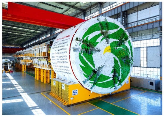 Figure 3 shows the super large diameter slurry balance shield used in the Chunfeng tunnel project. The shield was developed by the China Railway Engineering Equipment Group Co., Ltd. It is equipped with a normal pressure tool change, a main drive expansion, swing, tool wear protection and monitoring, and anti-mud cake with a scouring system [17]. The shield machine first uses a double crushing and grading slag soil treatment technology based on multi-stage treatment. A gear roller crusher is set in front of a slurry discharge pump for graded crushing of slag and stone and for increasing the particle size of slag discharge, which effectively reduces the risk of blocking and delayed discharge in the air cushion bin. Because of the construction risk of the section with a small curve radius (R = 750 m), the shield machine manufacturer developed a small curve tunnelling jamming early warning system, which successfully assisted the shield machine in completing this section. A shield was used in the Chunfeng tunnel project, with a maximum excavation of 12 m in a single day and an average excavation rate of 6 m/d. This represents the technical level of large-diameter slurry shield tunnel construction in China.