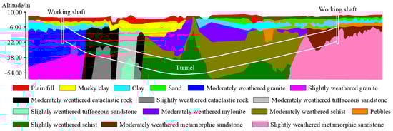 More than 80% of the geology of the tunnel crossing is a hard rock section underlying bedrock. The rock strata of the crossing section mainly includes granite, tuffaceous sandstone, cataclastic rock, schist and metasandstone. The maximum compressive strength of slightly weathered schist rock is 240 MPa. Medium permeable pressure bearing water exists in bedrock and structural fractures. The engineering geological profile is shown in Figure 4. The buried depth of the tunnel is 24~62 m. Considering the construction scale and difficulty, the Chunfeng road tunnel is the first of its kind in China [17].