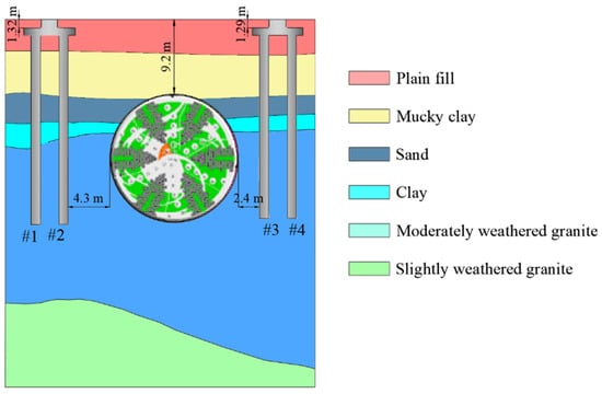 The shield machine of the Chunfeng tunnel is located between pile #2 and pile #3 of No. 1 bridge of the Hongling Interchange, 40 m after its start. The plane distance between the tunnel and pile #2 and pile #3 is 2.4 m and 4.3 m, respectively. The top elevation of the shield structure is −4.92 m, and the bottom elevations of pile #2 and pile #3 are −20.2 m and −21.2 m, respectively. Relative position relationship is shown in Figure 5. Here, the stratum is mainly plain fill, muddy clay, medium sand, gravelly sand, moderately weathered granite, and slightly weathered granite. The stratum crossed by the tunnel is mainly moderately weathered granite. The bearing stratum at the pile ends of pile #2 and #3 is moderately weathered granite.