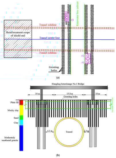 Grouting reinforcement scheme. (a) Plan of the grouting reinforcement scheme. (b) Section of the grouting reinforcement scheme.