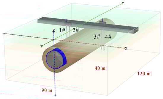 The finite element software PLAXIS 3D was used for numerical calculation, with a model size of 90 m × 120 m × 40 m (see Figure 7). The tunnel lining and bearing platform were simulated by solid elements. This paper mainly focuses on the responses between the piles and the tunnel. The simplified modelling of the lining was carried out by numerical simulation, and the influences of the segmented lining on the piles were not considered [26,27]. The pile body was simulated by an Embedded Pile structural element, which is a friction end bearing pile with a length of 23 m and a diameter of 1.2 m. The interaction between the pile and soil layers was determined through the coupling layer between the pile and soil layers. The coupling layer embedded in the pile element defaults to the stiffness and friction parameters in PLAXIS 3D. In order to obtain more accurate results, the elements near the piles were densified to make the grid size no more than 1 m. The load on the pile foundation is divided into two parts, one is the dead weight of the bridge, the other is the lane load and crowd load. The dead load of the bridge acting on each pile top was considered to be 1MN, and the movable load of vehicles was considered to be 200 kN. The load calculated according to relevant specifications was added to the foundation, and the load of each part of the model was determined in PLAXIS 3D [16].