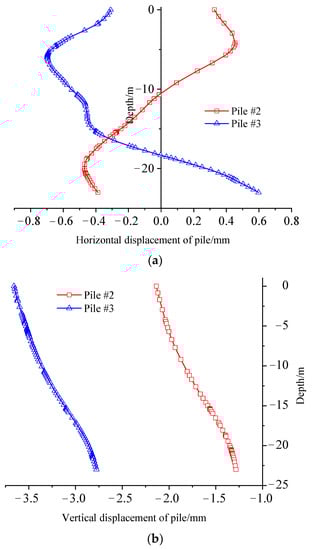 Deformation of piles #2 and #3. (a) Horizontal displacement. (b) Vertical displacement.