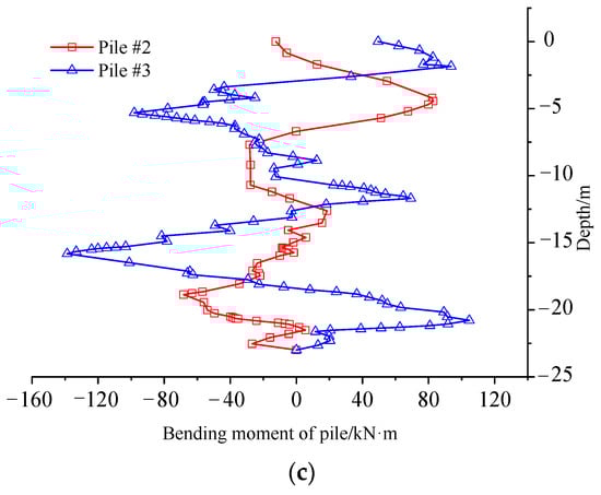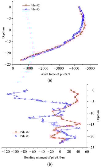 Figure 10 shows the internal force of pile #2 after excavation. It can be seen from the figure that the axial force of the pile is −500~−4681 kN, and the whole is in a compression state. Under the influence of negative friction within 7.5 m below the pile top, the pile body of the axial force tunnel increases with the deepening of the pile body, while within 7.5~23 m below the pile top, the pile body of the axial force tunnel decreases with the deepening of the pile body. Affected by the horizontal displacement of the pile body, the bending moment of the pile body in the direction perpendicular to the tunnel is more significant than that in the direction parallel to the tunnel. The maximum bending moment occurs at the 4 m position of the pile body, which is 83 kN·m. Figure 10 also shows the internal force of pile #3 after excavation. It can be seen from the figure that the axial force of the pile is −500~−4577 kN, and the whole pile is under compression. Under the influence of negative friction within 5m below the pile top, the pile body of the axial force tunnel increases with the deepening of the pile body, while within 5~23 m below the pile top, the pile body of the axial force tunnel decreases with the deepening of the pile body. The maximum bending moment of the pile body is 138 kN·m, which occurs at the position of 16m of the pile body. Generally speaking, the stress and displacement of pile #3 are similar to that of pile #2, but the stress and displacement are more significant than that of pile #2.