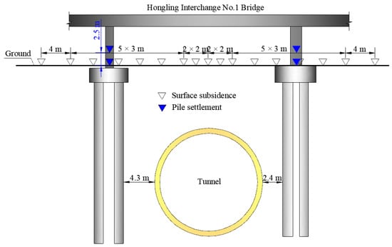 Figure 11 shows the layout of bridge piles and surface monitoring points. One surface heave and subsidence monitoring point are set every 5 m along the longitudinal direction of the surface above the tunnel, and one group of surface monitoring sections is set every 10 m. Settlement and inclination monitoring points are set on the bridge piles. A group of segment lining deformation monitoring points is set every five rings in the shield tunnel. Local adjustments are made according to the surrounding environment in the actual construction process.