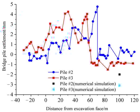 Figure 12 shows the vertical displacement of #2 and #3 bridge piles during the shield crossing of No. 1 bridge of Hongling Interchange. The monitoring value 30 m before shield crossing was taken as the initial value to analyze the impact on bridge piles during shield crossing. Before the shield passed through the bridge pile, the maximum vertical displacement of the bridge pile was −0.84 mm. Before the shield cutter head was driven from the bridge pile to the corresponding segment out of the shield tail, the slurry pressure and synchronous grouting pressure slightly higher than the theoretical value caused the bridge pile to float temporarily. After the shield tail passed through, the bridge pile sank about 1 mm. Through the secondary supplementary grouting measures, the bridge pile floated again. After the grouting was stopped, the monitoring value of the bridge pile had a cumulative settlement of 5 mm until the cutter head was 80 m away from the monitoring point. The maximum vertical displacement during excavation was −1.48 mm, which is less than the value of numerical simulation analysis to achieve a good reinforcement effect.