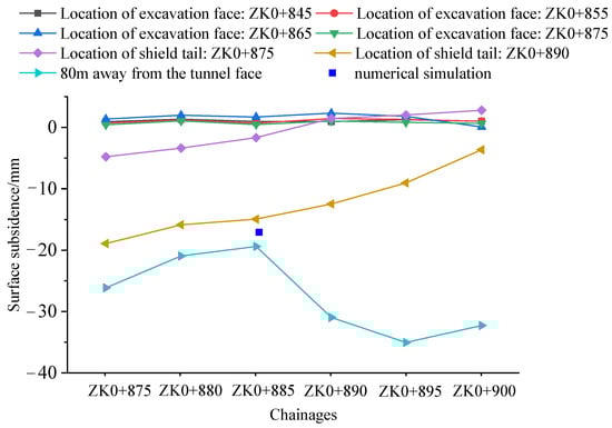 Figure 13 shows the surface settlements of different chainages at the position of the excavation surface during the period from 30 m in front of the No. 1 bridge of Hongling Interchange to 80 m after the shield crossing. Pile #3 of No. 1 bridge of Hongling Interchange is located at ZK0 + 890, and the corresponding chainage of pile #2 is ZK0 + 875. Within 30 m before the cutter head crossed, the surface settlement value of the upper part of the tunnel fluctuated slightly. With the continuous advancement of the shield machine, the ground surface was slightly uplifted. At this time, the pressure at the top of the slurry sump was 1.14~1.16 bar. When the shield cutter head was driven below the monitoring point, the ground surface sank slightly; the settlement value was 0.5 mm, and the corresponding pressure at the top of the slurry silo was 1.18 bar. When the segment below the monitoring point was out of the shield tail, a large settlement occurred at the surface monitoring points near the two bridge piles, and the average synchronous grouting amount in this process was 100%. With the continuous tunnelling of the shield, the surface settlement gradually stabilised; the maximum settlement was ZK0 + 895, and the settlement was 35 mm. The ZK0 + 890–900 surface had a significant degree of settlement compared with the surface within the scope of bridge pile reinforcement, indicating that bridge pile reinforcement reduced the disturbance impact of shield construction on the soil. Compared with the numerical simulation value, the on-site monitoring value was smaller, mainly because the grouting measures could be controlled according to the real-time settlement during the construction process to control the pile deformation effectively.