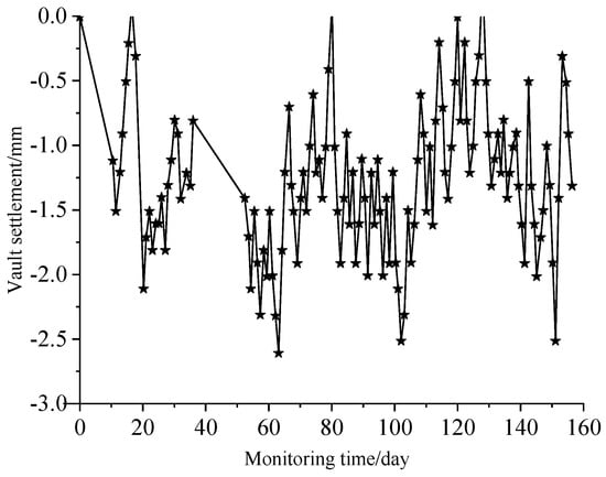 Figure 14 shows the vertical displacement change of the tunnel vault after the shield passes. After the last section, the supporting trolley started to monitor the displacement of the arch crown after crossing through and stopped monitoring after the shield was advanced by 350 m. The maximum displacement of the arch crown was −2.6 mm and finally stabilized at about −1.3 mm.