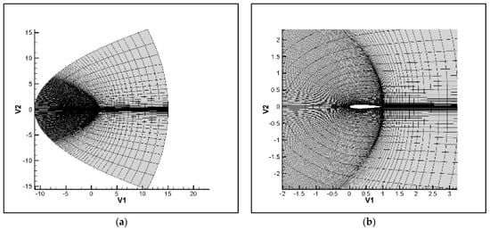 Grid topology of NACA0012: (a) global view of grid; (b) partial enlargement of grid.
