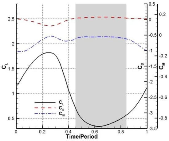 The variation of the coefficients of lift, drag, and pitching moment within a flapping period (gray shadow represents the course of upstroke).