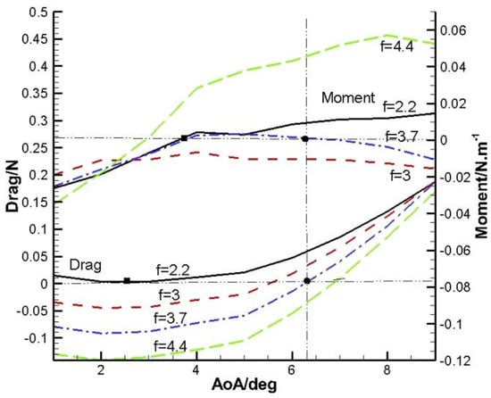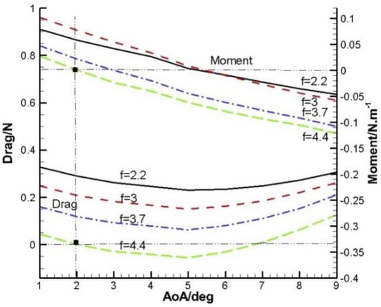 Comparatively, Figure 9 gives the results of the trim process through adjusting the angle of attack and flapping frequency, while keeping the forward-sweep angle at 28 degrees. It can be seen that at the same flapping frequency, the drag decreases first and then increases with the increase in the angle of attack, and the pitching moment increases with the increase in the angle of attack. The growth slope of the moment to the angle of attack is positive, resulting in unstable characteristics in the longitudinal direction. This means the forward-sweep motion will bring an unstable factor to longitudinal stability. As the frequency increases, the pitching moment first decreased and then increases, which shows a process of trade-off between the nose-down moment, produced by added thrust, and head-up moment, generated by forward movement of the aerodynamic center.