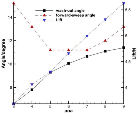 The flapping frequency of a seagull in cruising flight is usually in a fixed range, therefore this paper managed to find the trim state under a certain flapping frequency, such as 3 Hz. By changing the wash-out angle and the forward-sweep angle at the same time, we can obtain the trim state at different angles of attack. It can be seen from Figure 10 that with the increase in the angle of attack, the weight gradually increases. The wash-out angle gradually increases, while the forward-sweep angle first decreases and then increases. The above results show that in order to achieve equilibrium at 3 Hz, both the forward-sweep angle and the outer-sweep angle are indispensable, and the forward-sweep angle has a minimum value of about 11 degrees.