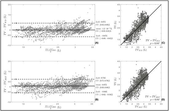 Bland–Altman plots for the comparison between: (A) prediction of tidal volume using wearable-device data () and breath-by-breath tidal volume (TV); (B) prediction of tidal volume using reference instrumentation () predictions and breath-by-breath TV; mean and limits of agreement (LoA) are reported, together with the related confidence interval (CI). Linear regression analysis for the comparison between: (C) prediction of tidal volume using wearable-device data () and breath-by-breath tidal volume (TV); (D) prediction of tidal volume using reference instrumentation () and breath-by-breath TV; correlation coefficient is reported (ρ), together with statistical significance (* indicates p < 0.05).
