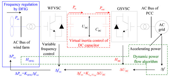 The DFIGs under the derated mode may respond to system frequency change with the over-speed or the pitch angle control [7]. Instead of a wide-area signal, the virtual inertia/droop control responding to the local frequency may be applied [8,9,10,11]. But for the DFIGs integrated through the VSC-HVDC, the system frequency is more vulnerable to the disturbances and faults, due to not only the fluctuation of the wind power but also the isolation of frequency response of the DFIGs by VSC-HVDC. The cascaded droop control from the system frequency to the DC voltage of the VSC-HVDC and then to the active output of the DFIGs is an effective scheme [12]. With the virtual inertia control [13,14], the stored energy of the DC capacitor of the VSC-HVDC is released to provide fast support to the system frequency. Then according to the drop of the DC voltage of the VSC-HVDC, the DFIGs change their output by releasing their kinetic energy and reserved power.