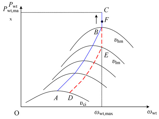 When ignoring the active power loss of the DFIG and assuming that the induction generator and converters provide a fast response, the output of the DFIG can be approximated to the captured power of the wind turbine (WT), i.e., Pwt. The relationship of Pwt to the rotor speed, i.e., ωwt, is shown in Figure 4, where υci is the cut-in wind speed υ, υlm and υhm are the critical values between the slow, the medium, and the high ranges of υ. The subscript max denotes the maximal value.