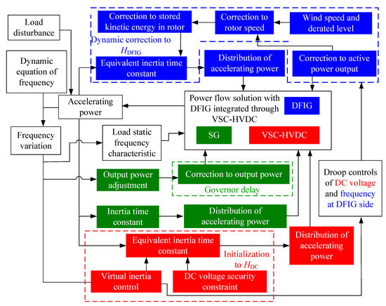Finally, the improved DPF model with the frequency regulation by the DFIG integrated through VSC-HVDC and the SG of governor delay is shown in Figure 5. Compared with the existing DPF model, the governor delay is considered in the output of the SGs, and the virtual inertia of the VSC-HVDC is set based on the estimation to the frequency nadir and constraint of the DC voltage. The inertia of the DFIG is corrected according to the changing kinetic energy for a more accurate frequency response.
