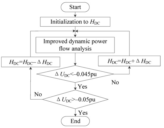 Therefore, to further increase the system inertia, the proposed DPF model may be applied to evaluate the maximum DC voltage deviation with existing HDC, and its value is adjusted to provide the maximum inertia without violating the constraint of the DC voltage. The optimization of HDC is carried out in each time step for the optimal inertia during the process of frequency regulation, as shown in Figure 6.
