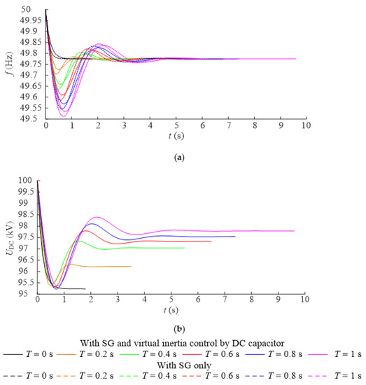 If the governor delay of the SG is ignored, the system frequency drops without oscillation. The nadir is the steady state value. When considering the governor delay, the SG cannot provide full support at the early stage, e.g., 0–1 s. With the virtual inertia control of the VSC-HVDC, the DC voltage is temporarily reduced to slow down the frequency drop (see Figure 7a). After activation of the primary control, the SGs’ output is adjusted according to the static frequency characteristics. The system frequency reaches the steady-state value, but the nadir occurs at the early stage of the regulation, and is lower than that without the delay. It is also found that the larger delay yields a slower process to reach the steady state value.