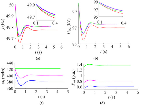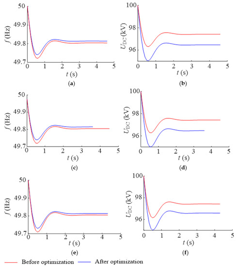 With the optimized HDC, the inertia provided by the VSC-HVDC is further enhanced, thus the transient drop rate of the system frequency is reduced (see Figure 9a,c,e). The maximum UDC approaches the constraint, showing that the stored energy in the DC capacitor is fully utilized to prevent frequency drop (see Figure 9b,d,f)). The larger deviation of the DC voltage leads to more output of the DFIG (see Table 3), and less deviation of the steady-state frequency. The above conclusions are validated under different ranges of the wind speed.