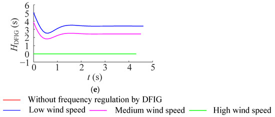 With the inertia support from the DFIG, the transient drop rate of the frequency is reduced. Under the high wind speed, the rotor speed of the DFIG is fixed at the maximum value. No inertia is provided, leading to the comparatively weak regulation capability (see Figure 8a). The rotor speed of the WT is adjusted to reach the captured power to respond to frequency drop (see Figure 8d). The rotor speed is shown in Figure 8c, indicating that the kinetic energy changes during the regulation. Thus, the constant inertia based on the initial rotor speed overestimates the DFIG’s inertia, and requires dynamic correction based on the change of the rotor speed (see Figure 8e).