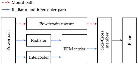 The vibrations produced by the idling engine are mainly transmitted along two paths from the engine to the body floor, as shown in Figure 2. The first path lies through the mounts of the powertrain, whereas the second path lies through the radiator or intercooler. First, the powertrain mount serves as the path through which the vibration is transmitted sequentially from the powertrain, three mounts, the front side member, and the body floor. The side member structurally supports the powertrain and imparts strength and rigidity to the front body. The powertrain mounts reduce the idling vibrations caused by the explosive force of engine, which are transmitted to the body floor. The powertrain used in this study is supported at three points by an engine mount, a transmission mount, and a roll mount. Herein, the engine and transmission mounts are fixed to the right and left side members, respectively, and the roll mount is fixed to the cross member. The side and cross members are welded and strongly bonded to the body floor.