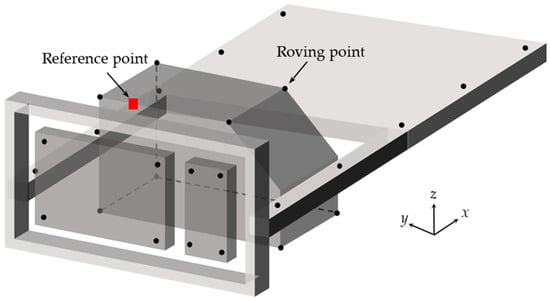 To obtain the ODSs of the components, we used triaxial accelerometers (PCB 356A15) capable of sensing vibration signals in three mutually perpendicular directions. The accelerometers are attached to the measurement points to obtain the ODSs, as shown in Figure 3, wherein the squared and circled markers represent the measurement points for the reference and roving vibration signals, respectively. The reference signal was measured at the top end of the engine, whereas the roving signals were measured at the designated points to identify the behavior of each component. To obtain the ODS of the powertrain, vibration signals were measured at a total of eight points (four points at the top and four points at the bottom of the powertrain). To acquire the ODSs of the radiator and intercooler, vibration signals were measured at eight points, each with four vertices. Finally, vibration signals were measured at two points on each side member, a total of four points, and six points on the car body floor to analyze the ODSs of the side members and body floor.