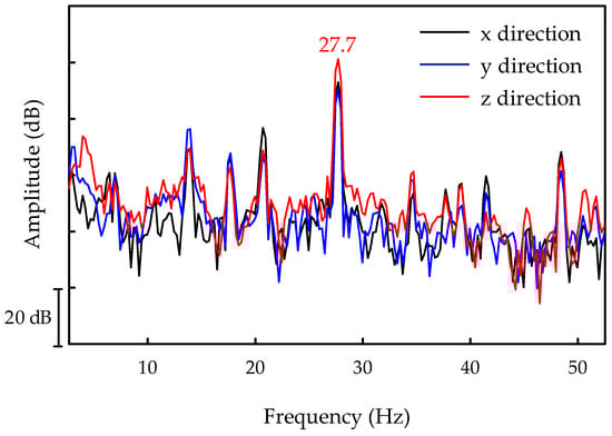 The vibration signals measured by the accelerometers were analyzed by a sound and vibration analyzer (B&K 3560-D) with 60 channels to obtain the ODSs. The amplitudes and phases of auto-spectra and cross-spectra were obtained using the analyzer. Based on these measurements, the ODS frequency response functions of the roving signals with respect to the reference signal were extracted, and subsequently, the ODS of each component was derived. The ODSs were measured for an operating engine speed of 830 rpm in the idle engine state. Considering the four-cylinder diesel engine of the SUV, the excitation frequency emitted by the engine in the idle state was 27.7 Hz. The frequency spectra for vibration signals in the three mutually perpendicular directions at the position of the driver’s seat on the body floor under idling engine conditions are depicted in Figure 4. As shown in this figure, the spectra exhibit large peaks at the idling frequency of 27.7 Hz. The ODSs of the powertrain, radiator, intercooler, and body floor of the SUV were analyzed at an engine excitation frequency of 27.7 Hz in the idle state (Figure 5). All motions appearing later are described based on the global coordinate system.