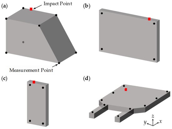 Impact and measurement points for the experimental modal tests: (a) powertrain; (b) radiator; (c) intercooler; and (d) body floor.